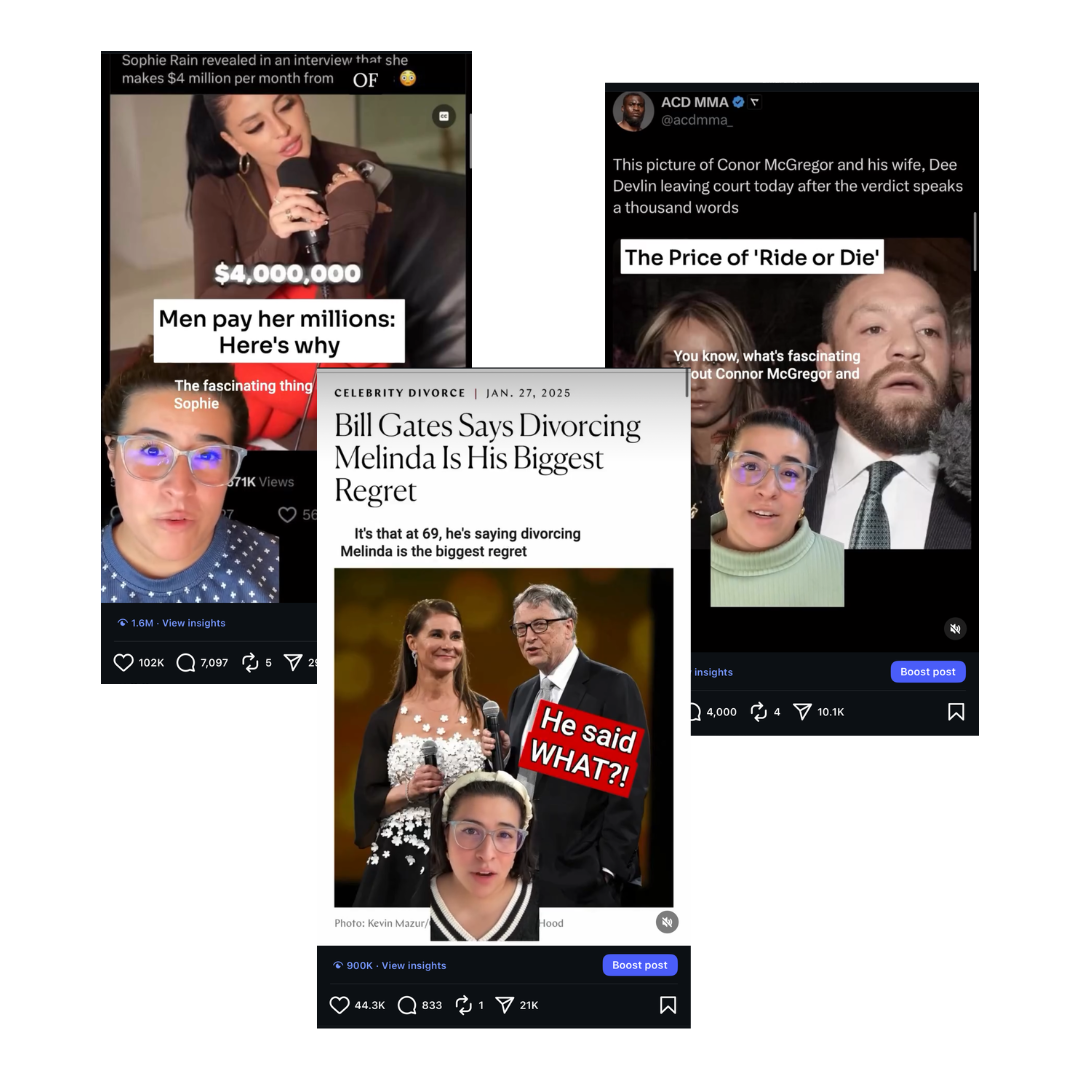 The Creative Solution: I designed and executed an experimental campaign series that tapped into cultural zeitgeist moments, creating provocative relationship commentary around trending public figures and current events. When the client preferred to remain off-camera, I pivoted to serve as the on-screen talent while maintaining her authentic voice and expertise.